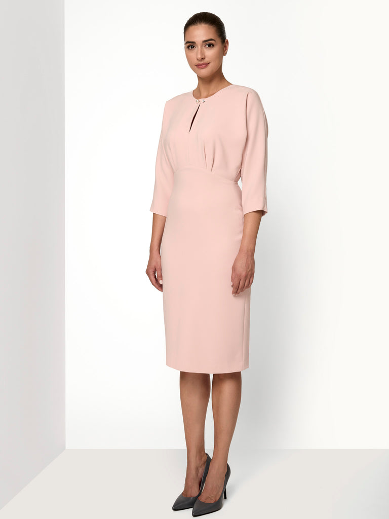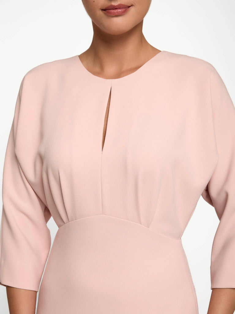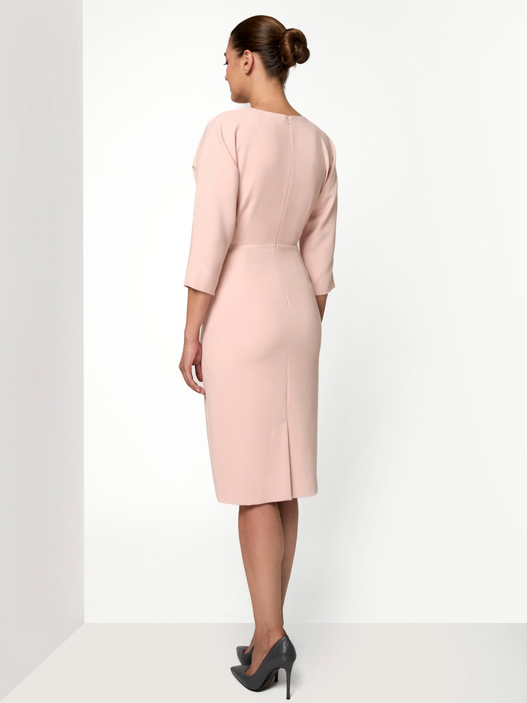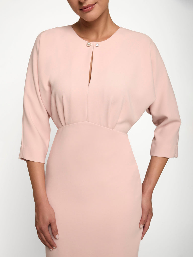 Rochia Amelia aduce impreuna feminitatea clasica si accentele moderne printr-un detaliu subtil cu perla si cristal in zona decolteului. Cu o croiala conica, maneci 3/4 si nuanta blush sofisticata, este alegerea perfecta pentru evenimente in care eleganta fara efort este cheia.