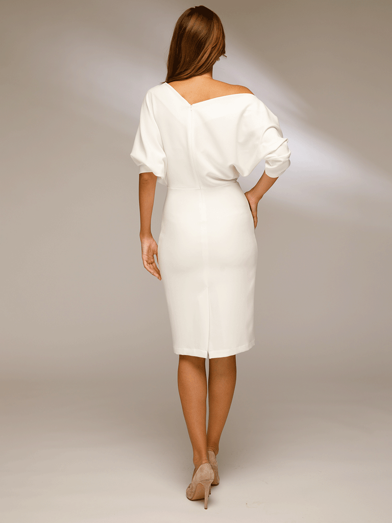 Rochia prezinta drapaj in talie, iar sistemul de inchidere este asigurat de fermoar ascuns.