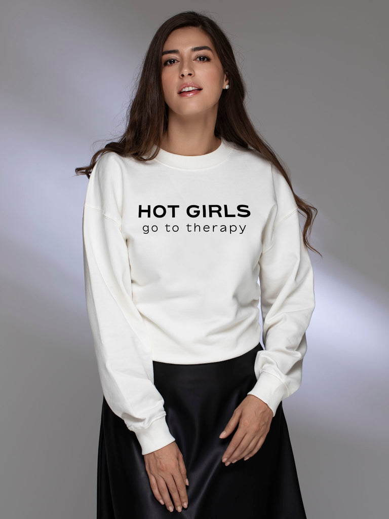 Hanorac alb din bumbac organic cu imprimeu de catifea HOT GIRLS GO TO THERAPY