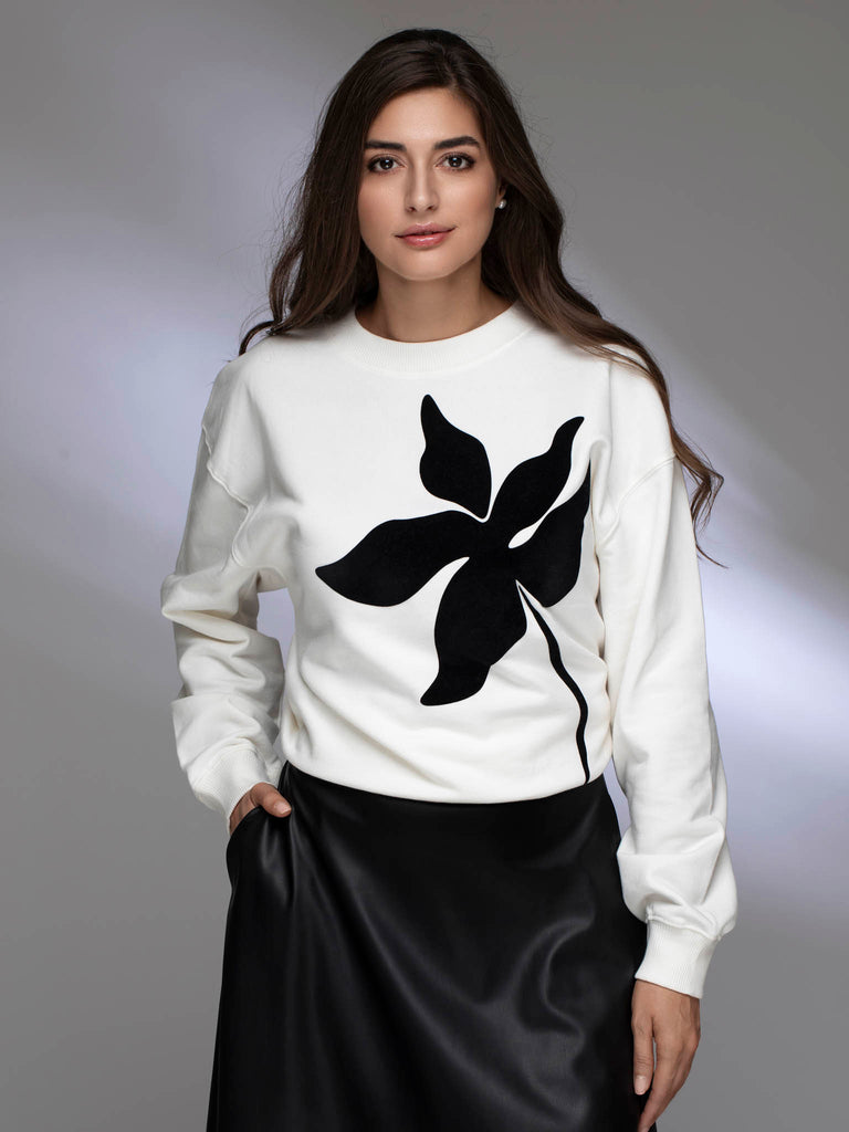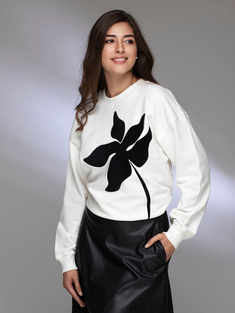 Hanorac alb din bumbac organic cu imprimeu de catifea LEAF GLOW