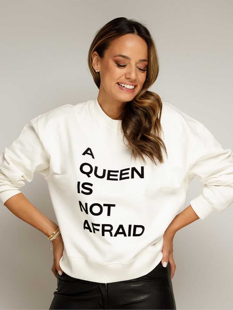 Piesa etalon in orice garderoba, hanoracul alb este minimalist si clasic prin definitie. Din bumbac organic moale la atingere si decorat cu imprimeul distinctiv din catifea, hanoracul A queen is not afraid cu croi stylish si lejer poate fi asortat la o varietate de tinute.