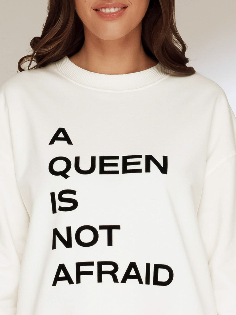 Hanorac alb din bumbac organic cu imprimeu de catifea A queen is not afraid