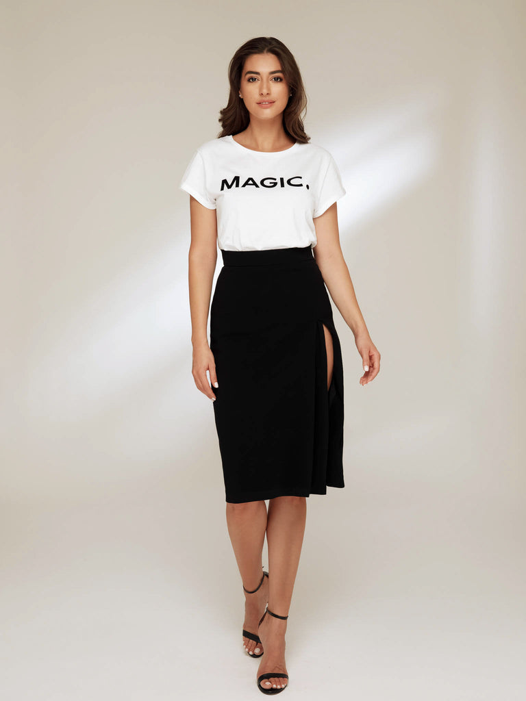 Piesa etalon in orice garderoba, tricoul alb este elegant prin definitie. Din bumbac organic moale la atingere si decorat cu imprimeul distinctiv din catifea, tricoul MAGIC cu croi clasic si lejer poate fi asortat la o varietate de tinute.