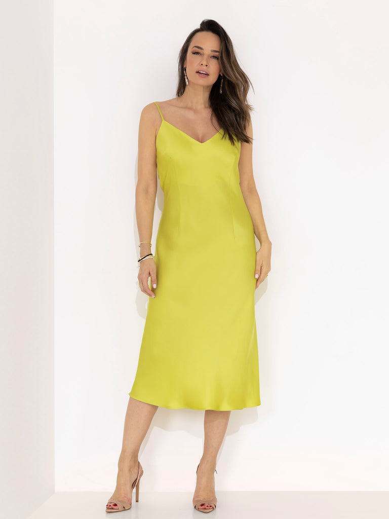 The dress has a bias cut, and the straps have metal rings that help adjust the length.