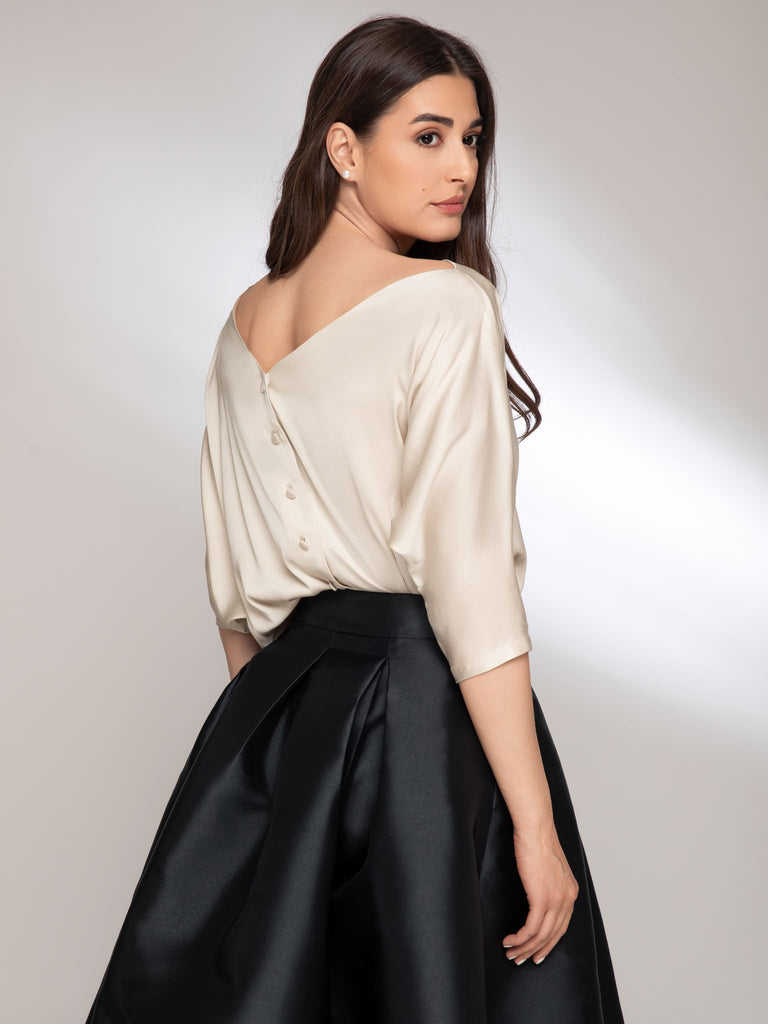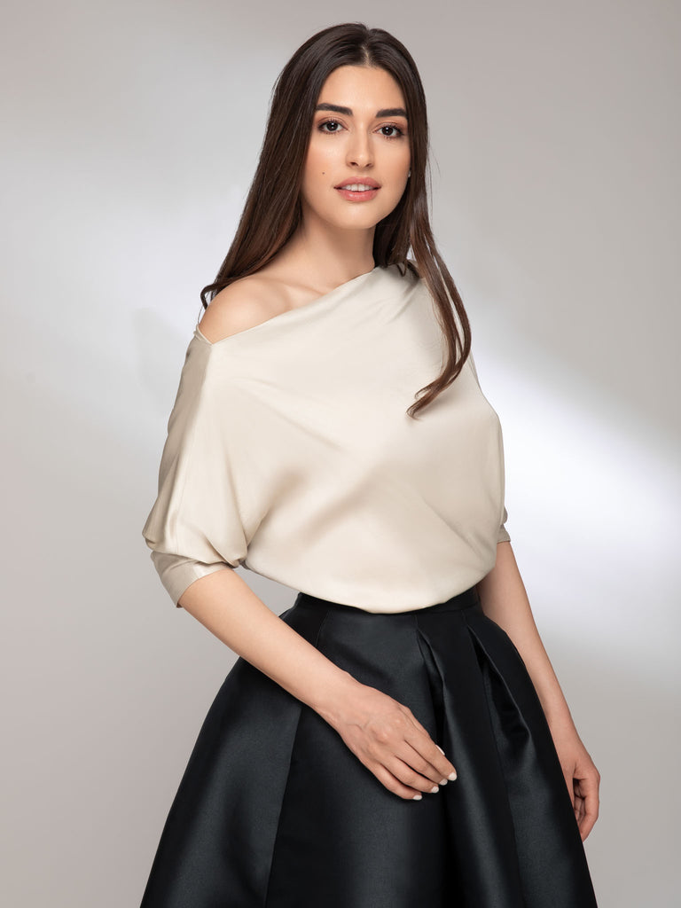 The Grace blouse is the essential piece for the woman who wants effortless elegance. The asymmetrical drape and one-shoulder line subtly contour the silhouette, offering a sensual and refined air. Decorative buttons and a relaxed cut complete a versatile design, easy to adapt from day to night.
