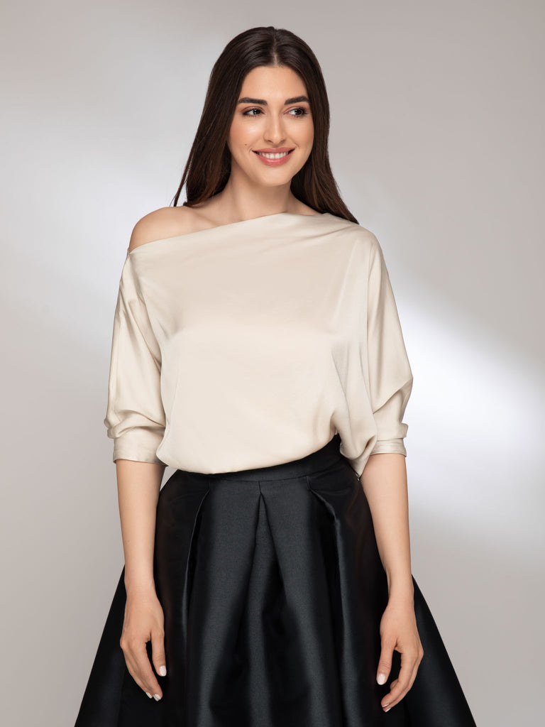 Loose fit, asymmetrical drape, off-shoulder