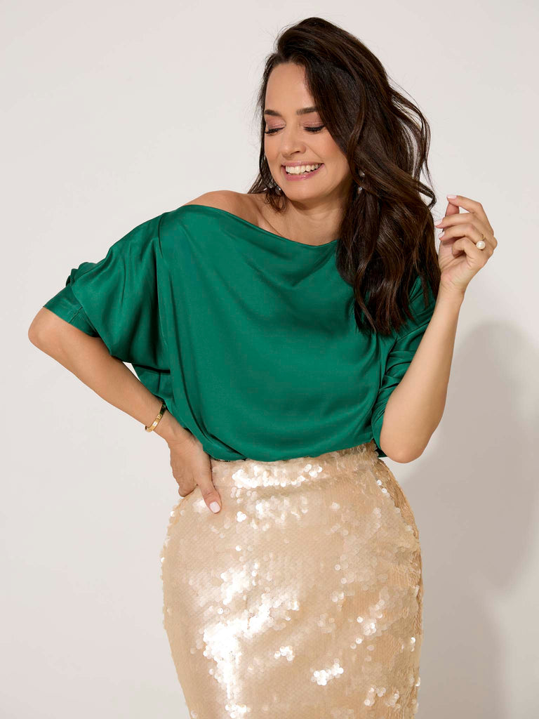 The Grace blouse is the essential piece for the woman who wants effortless elegance. The asymmetrical drape and one-shoulder line subtly contour the silhouette, offering a sensual and refined air. Decorative buttons and a relaxed cut complete a versatile design, easy to adapt from day to night.