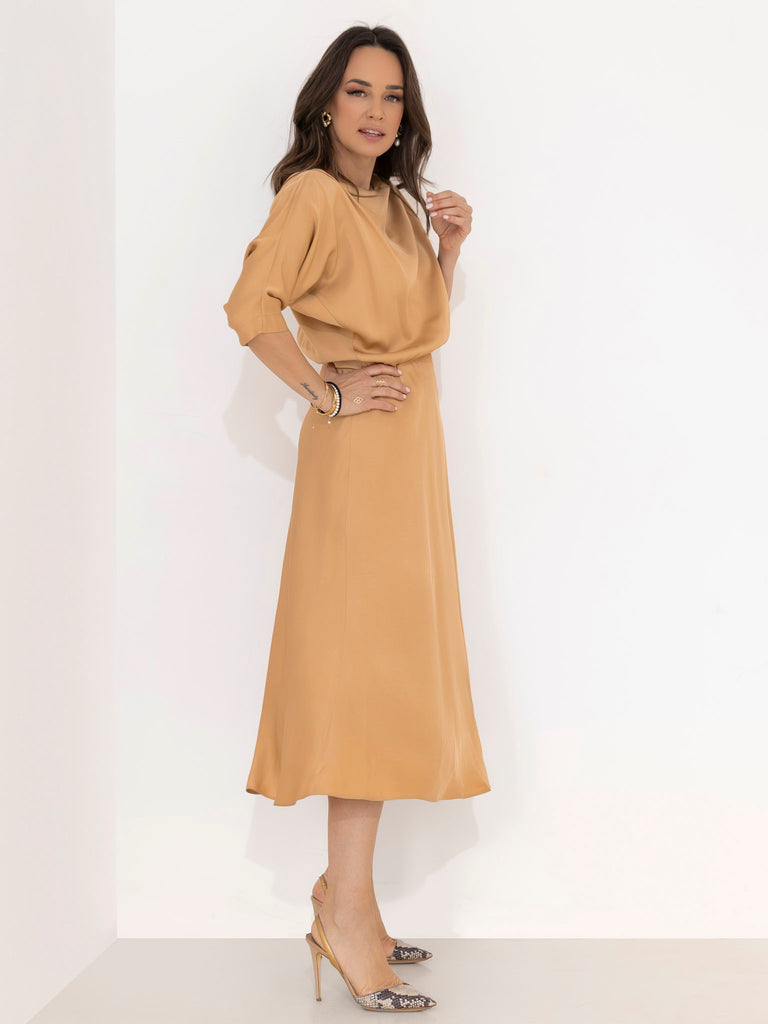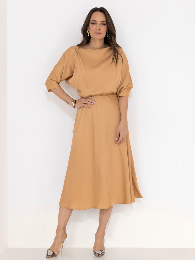 The Bella dress is the perfect choice for a special evening or an elegant event, where comfort blends harmoniously with style. This subtly refined dress is made of glossy viscose, which gives the material a smooth appearance and velvety texture. The cut of the dress is loose, falling gently on the body and following the line of the silhouette, giving it a diaphanous air.