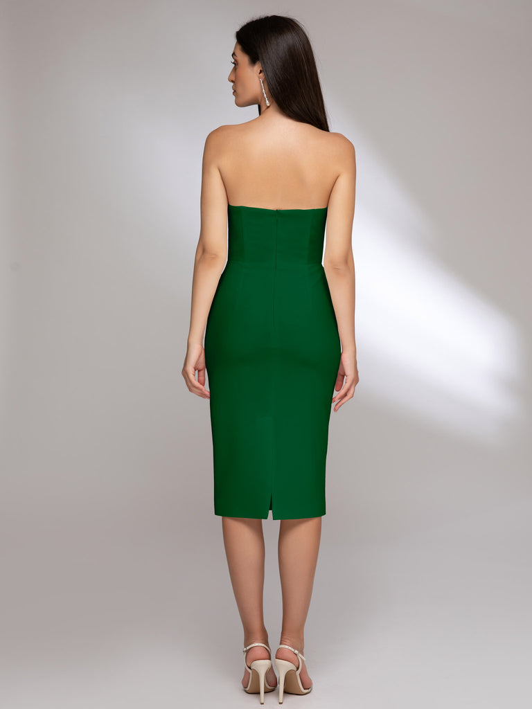 Shine at any special event with this dress. The corset attracts all eyes and provides the necessary support for an impeccable silhouette, and the balconette neckline adds an extra touch of sensuality. The bare shoulders gracefully complete this sophisticated and seductive look. Ideal for special events, weddings or elegant parties. The tapered, midi-length skirt molds to the body, offering an elegant silhouette.