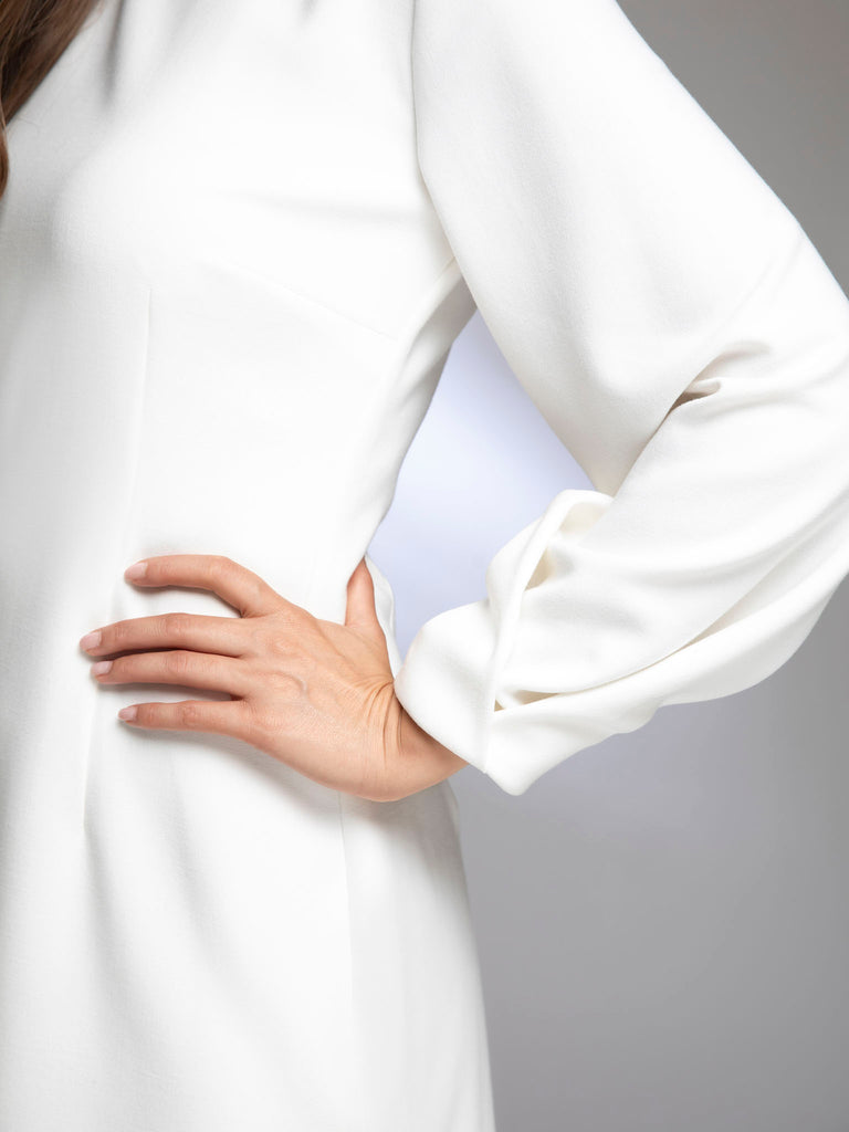 This dress stands out for its delicately pleated sleeves, which add extra volume and texture. The lightweight material falls delicately on the body, while the pleated sleeves add a sophisticated touch.