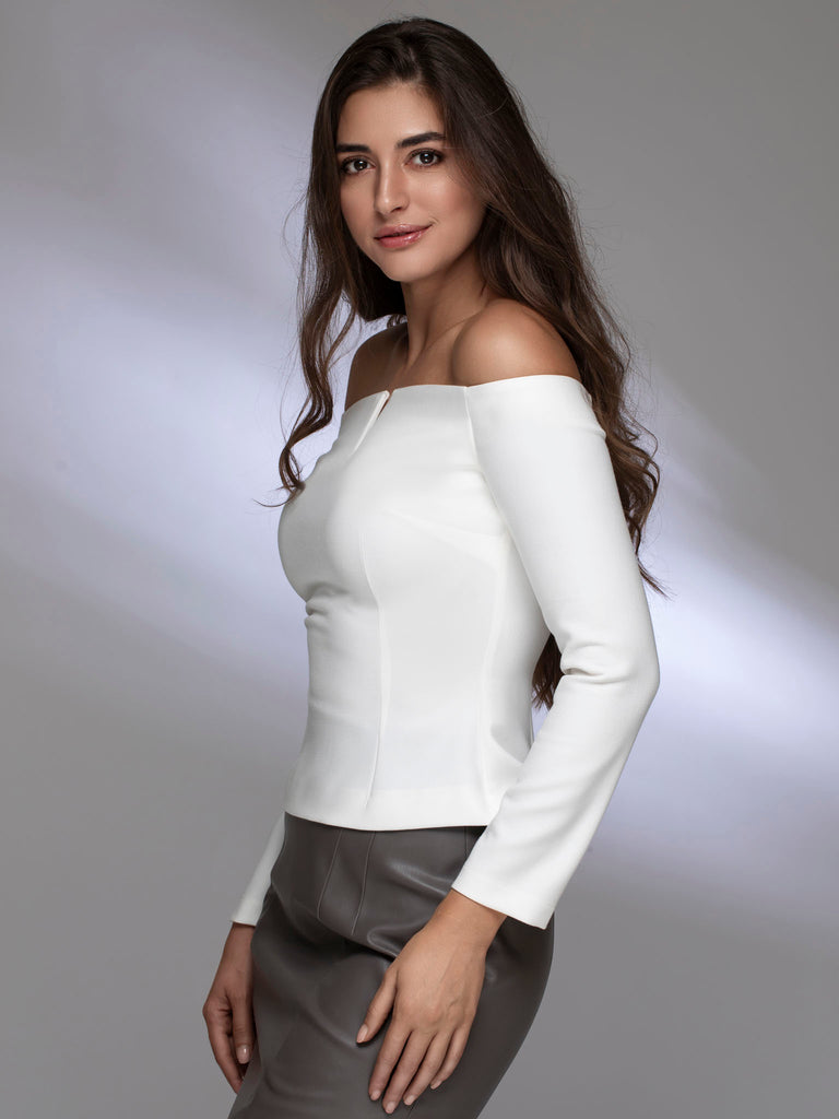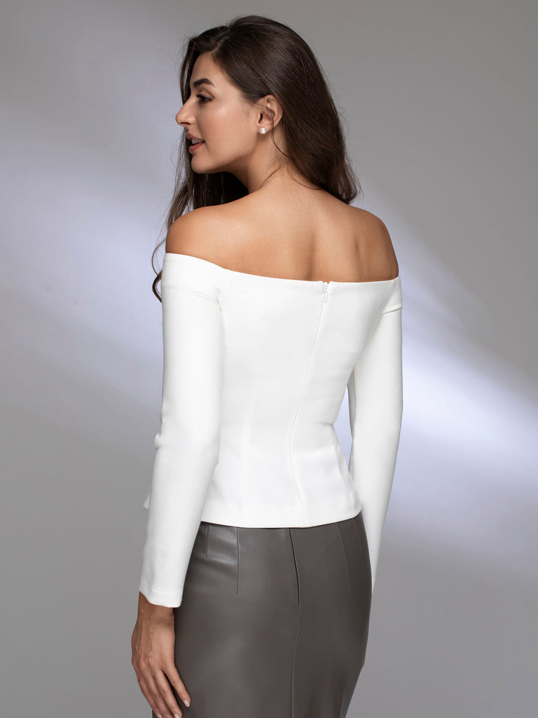 The Stella blouse is a modern reinterpretation of the classic off-the-shoulder top. The fitted cut discreetly highlights the shoulder and neck line, and the V-neck with geometric cutout adds a touch of boldness. The fine material offers all-day comfort, making this piece ideal for feminine and versatile outfits.