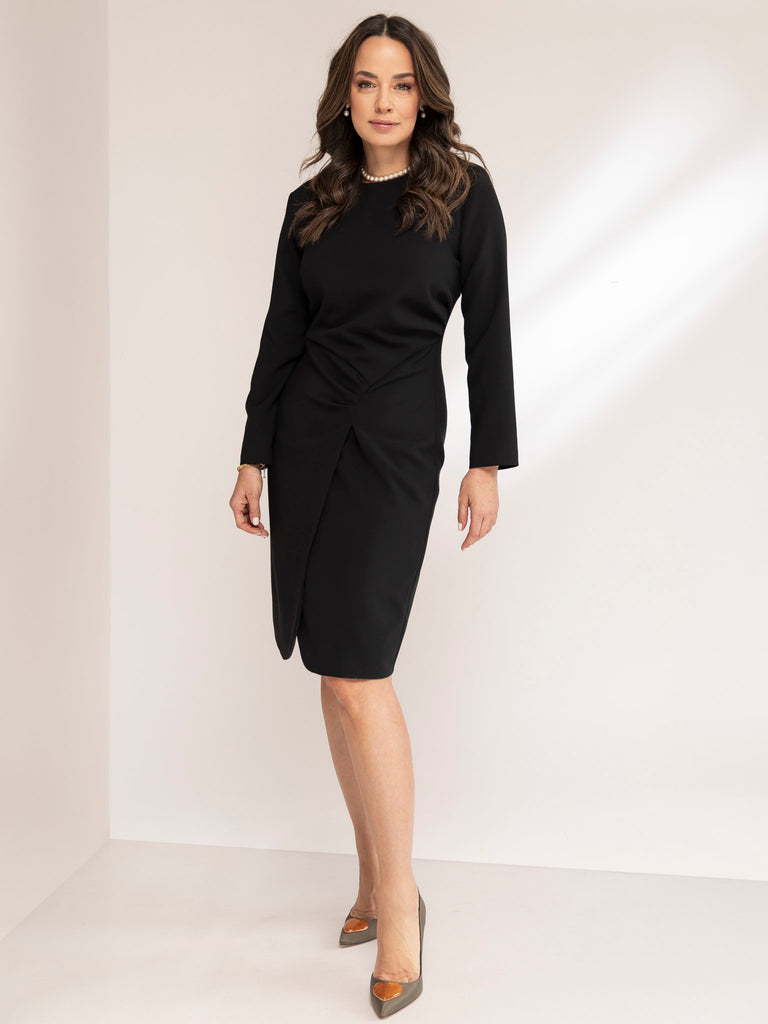 Adeline asymmetrical front slit knee-length dress with side pleats